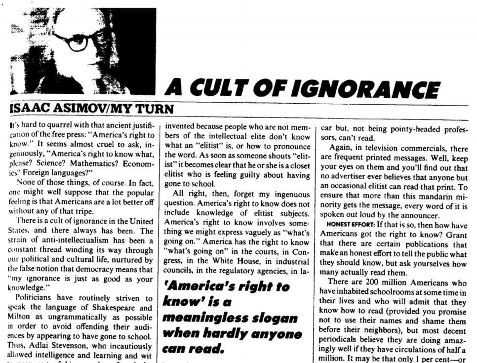 En enero de 1980, Isaac Asimov denunció en el artículo A cult of ignorance una política que terminaría imponiéndose no solo en USA sino en gran parte del mundo: el ...
