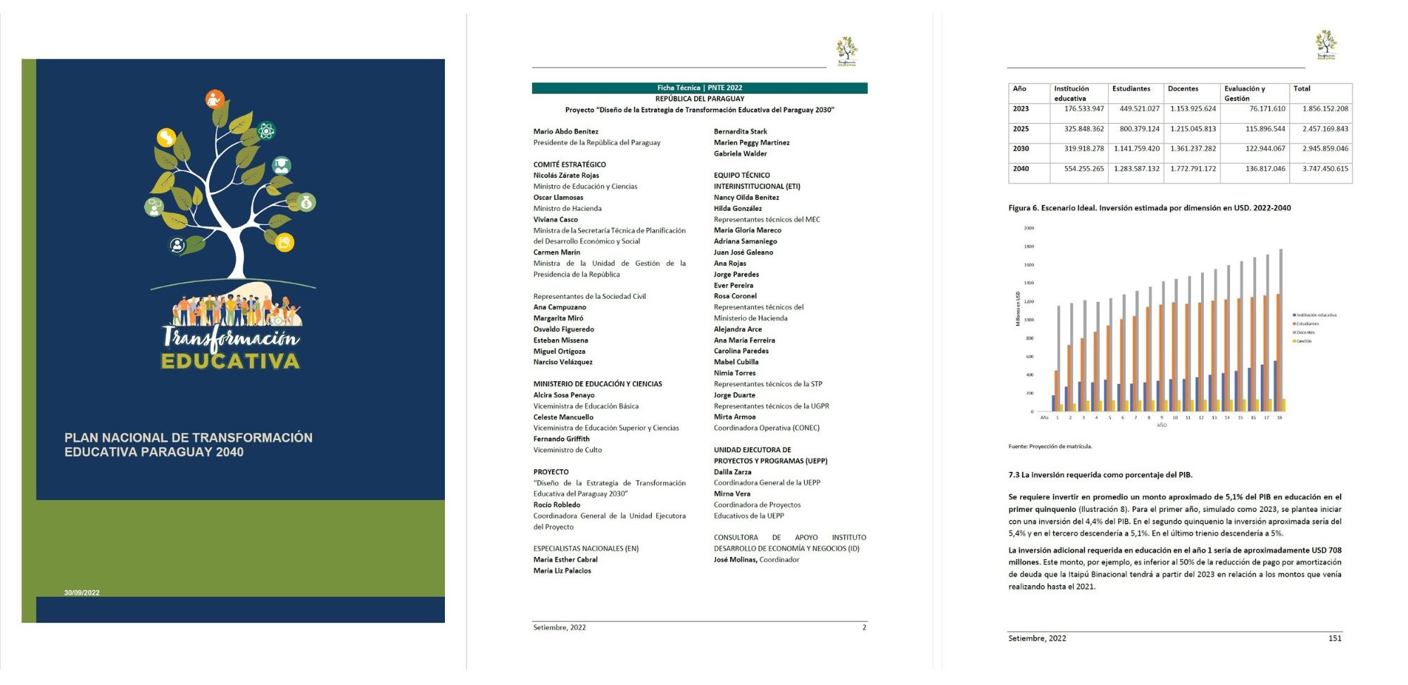 Entre las preguntas frecuentes sobre el PNTE está: «¿Quiénes lideran este proyecto?» Los responsables están en la segunda página del Plan. Entre los objetivos principales del mismo se encuentra una deuda histórica del Paraguay: aumentar el porcentaje del Presupuesto General de la Nación destinado a la educación pública.