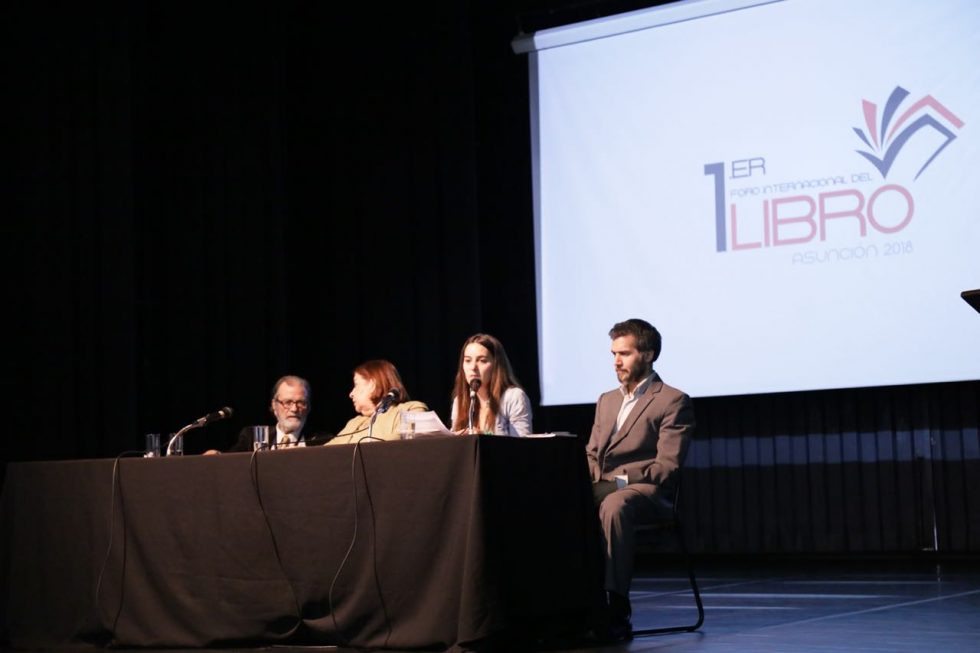Ponencia de Gabriela Arcondo en la mesa 8: Editar libros... ¿solo imprimir y vender?, con Fernando Fajardo (España), Jairo Araldi (Brasil) y Matías Cardozo, durante la noche del viernes 7 de setiembre.
