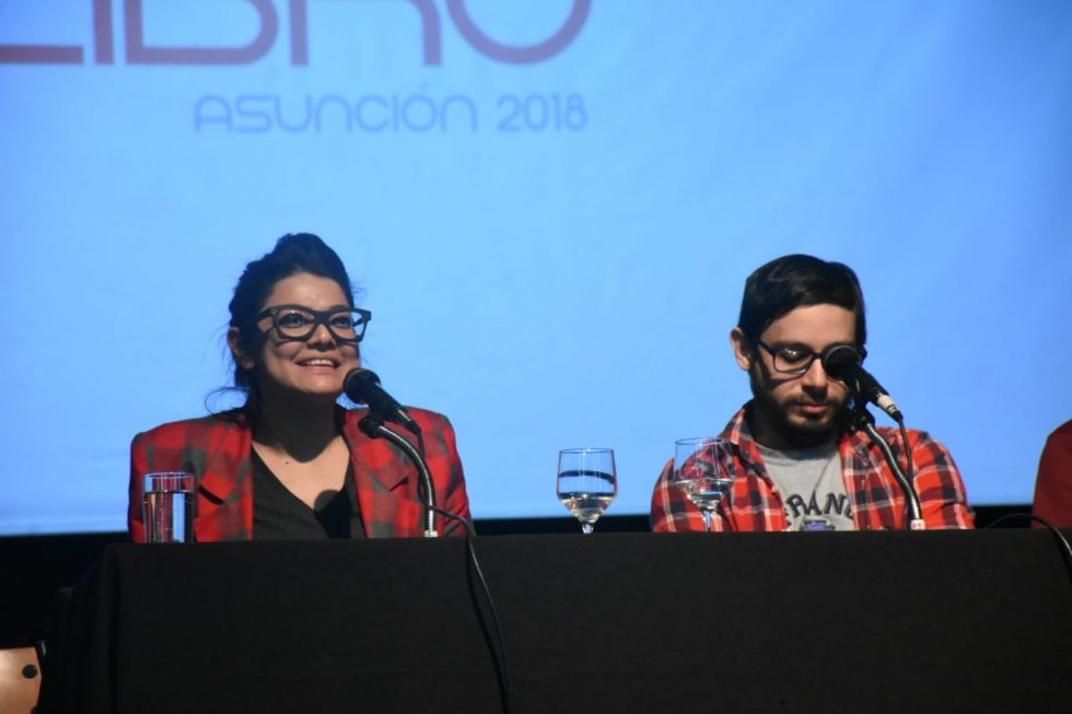 Undécima mesa del Foro Internacional del Libro de Asunción, con Mónica Bustos, Eduardo Quintana, Sebastian Ocampos y Fátima Acosta (moderadora).